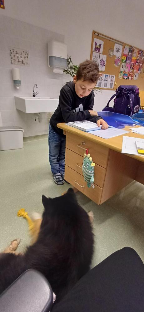 Unser Schulhund Gino ist ein 5 jähriger Samojedenmischling und ein ausgebildeter Therapiehund. Immer dienstags und freitags besucht er unsere Schule und sorgt für Abwechslung im Schulalltag. Am liebsten wird er gestreichelt und die Kinder lassen sich nicht lange bitten und knuddeln um die Wette. Wenn er dann mal nicht die Hauptaufmerksamkeit der Kinder erhält, kommt es nicht selten vor, dass er sich mitten in eine Kindergruppe, die am Boden arbeitet, legt. Jaja, so ist unser Schulhund. Dien Kinder aber auch das gesamte Schulpersonal lieben ihn und er liebt sie. Da würde ich sagen, nicht gesucht, dennoch gefunden.